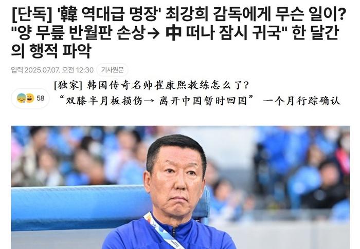 2025年7月7日,韩国媒体“SPOTV News”突然冒了出来,为韩国籍教练崔康熙正名,特地“高度还原”了老崔一个多月的活动诡计。据韩媒所说,外界都错怪崔康熙了,实际上他一直在带病工作,从上个月开始就半月板受伤了。就在上个月,山东、北京、上海多个城市的专科医生都建议他做手术,但崔康熙为了不耽误工作一直没有同意手术。