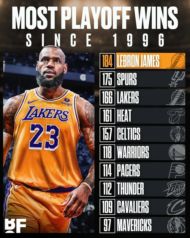 07月 14 2025 0 让10年😲詹姆斯季后赛胜场数超96年来所有队 他06年才打季后赛 xiaoqiao 2025-07-14 英超 125 美媒BF晒图,詹姆斯季后赛胜场数184场,超越1996年以来所有的球队,球队里排名前五的是:马刺175场、湖人166场、热火161场、凯尔特人157场、勇士118场。