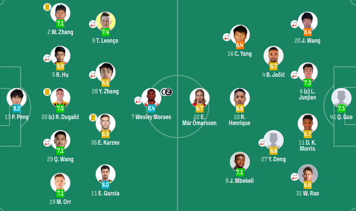 后卫:20-王嘉楠(93'23-杨瑞琦)、6-廖均健(81'5-田子羿)、11-莫里斯(F)、31-饶伟辉(46'17-杨一虎)