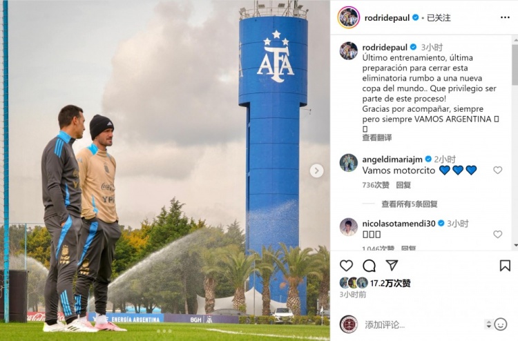 阿根廷中场德保罗社媒晒出与主帅斯卡洛尼的合照,并写道:“最后一次训练,最后的备战,为通往世界杯的预选赛画上句号,能参与其中深感荣幸!